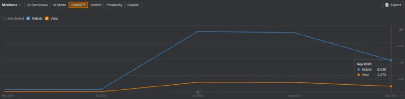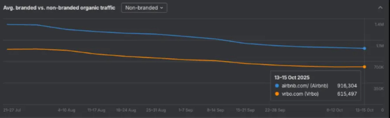 Despite all the LinkedIn takes insisting “GEO is basically SEO,” the data is starting to show some real separation. The Airbnb–Vrbo comparison in this recent SEJ article is a perfect example: Their organic search performance tracks pretty closely, but their AI Search visibility does not.
